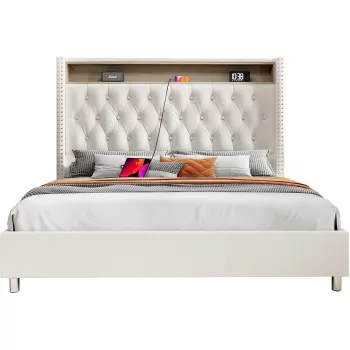 Queen Bed Frame with LED Lights, USB Charging, Storage Headboard, No Box Spring